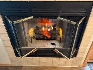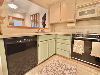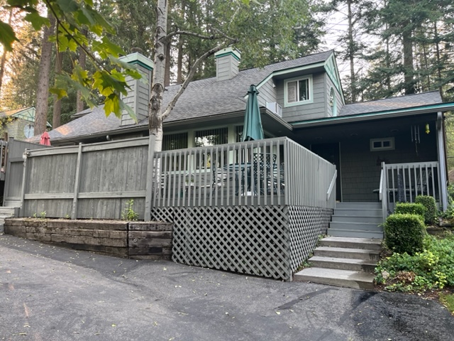 The living and dining area is filled with natural light, featuring large windows and an electric fireplace, creating a welcoming space to relax. The well-equipped kitchen includes ALL full-size appliances, cookware, and utensils. Additional conveniences include an in-unit washer and dryer, dual A/C units, baseboard heat, and supplied linens for an easy move-in experience. Enjoy the large wrap-around deck with a new barbecue grill, lounge chairs, a table, and a shade tree.