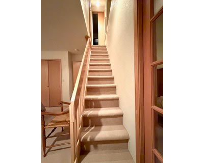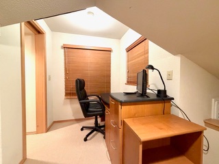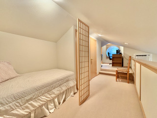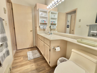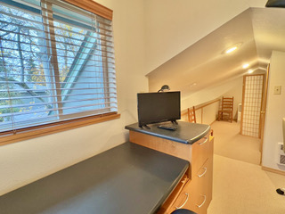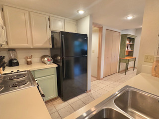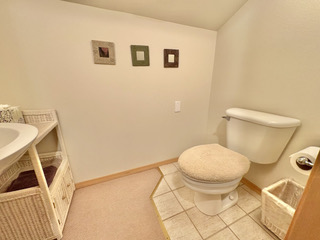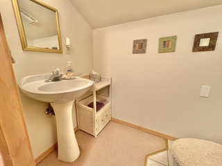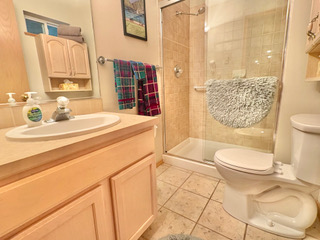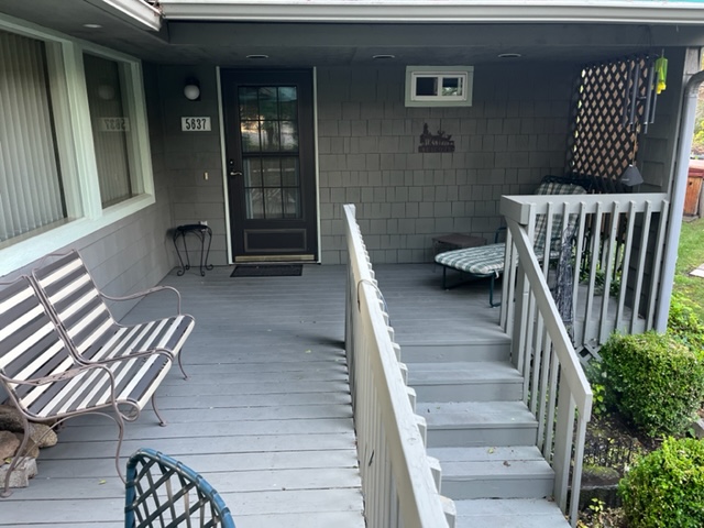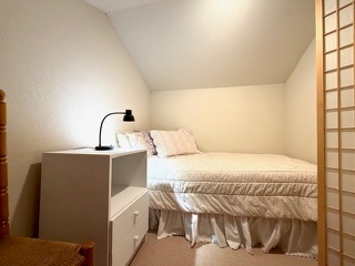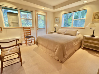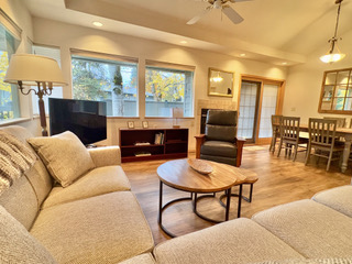 The duplex accommodates up to 5 (five) people. There are two bedrooms with separate bathrooms (one king bed and one queen) downstairs, and a single bed with a half-bath upstairs. The interior was freshly painted in 2025 with the addition of new window shades and living room and dining room furnishings.